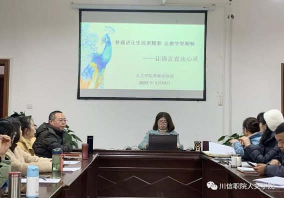 会议分为四个议程,首先由段晓丹副教授进行普通话讲座,从学习普通话的目的、推普意义、普通话语音知识及学习普通话方法等方面展开,取得了良好的效果,从而开启在校内全员讲普通话的先例。